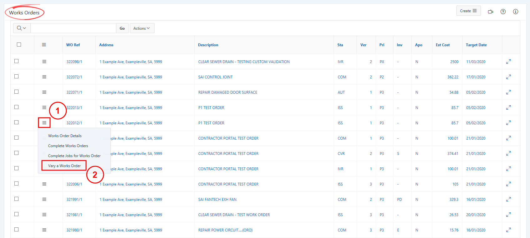 3. From the Works Orders region, select the Row Action Icon for the relevant works order and select Vary a Works Order.