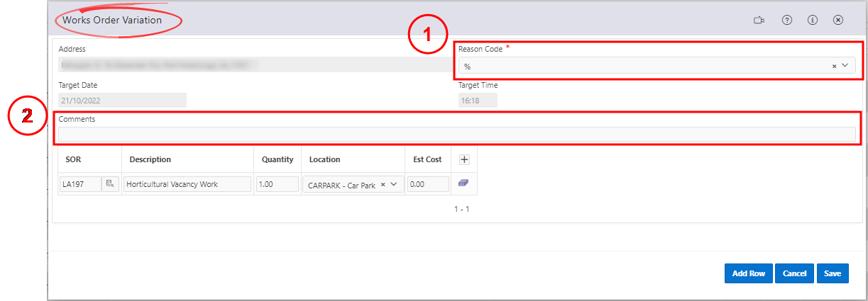 4. On the Works Order Variation window, select the reason for the variation from the Reason Code drop-down. Enter any relevant comments about the variation in the Comments field.