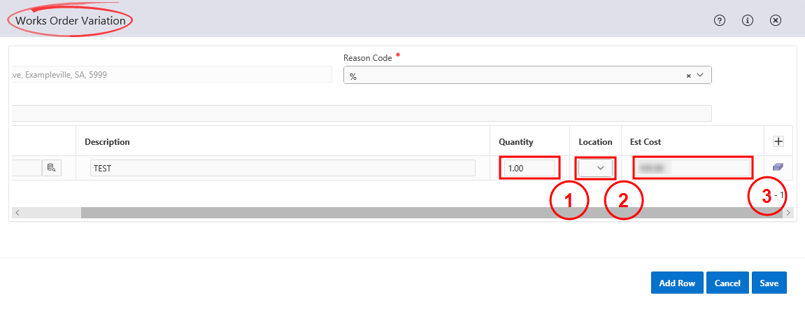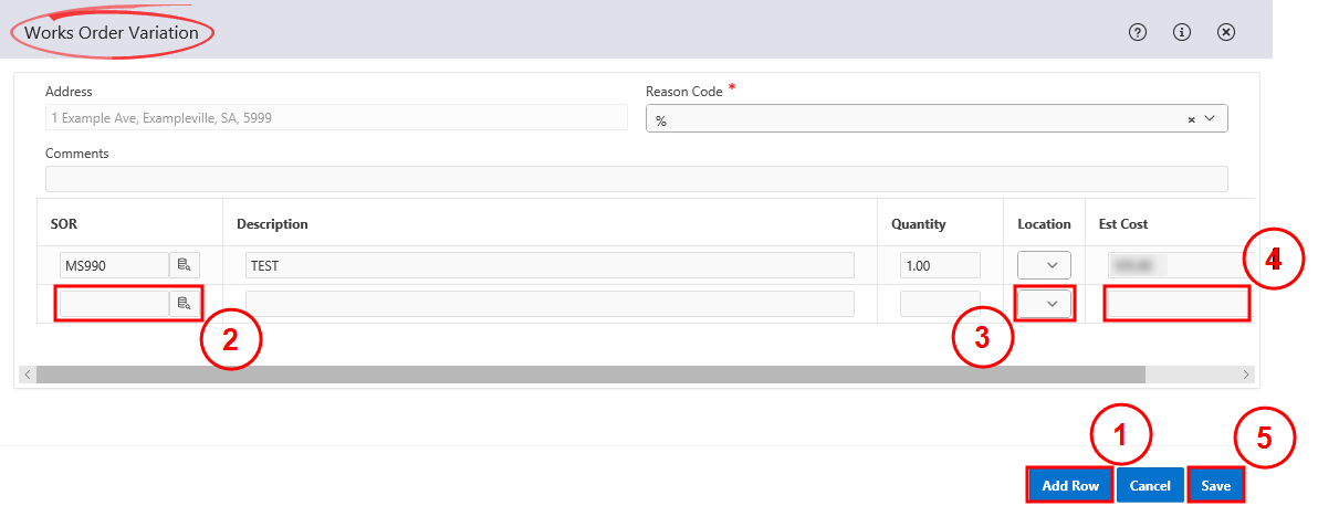 - in the Est Cost field, enter the estimated cost of the work, if available.