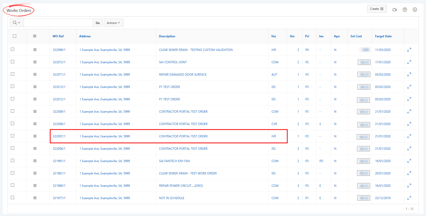 6. If the variation request has been approved, the status of the works order will display as ISS for Issued or COM for Complete, and the version will increase.